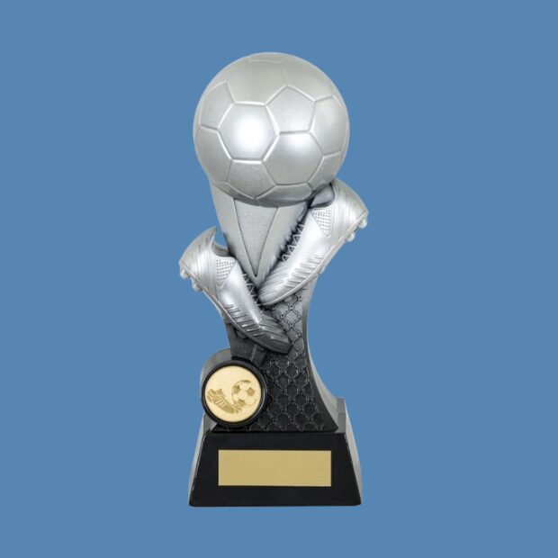 The design features a bold football sitting above a pair of boots, giving the trophy clear sporting character and purpose. Available in three sizes, the Nova Evolution Black and Silver Trophy offers flexibility while keeping the same strong, eye-catching look across the range.