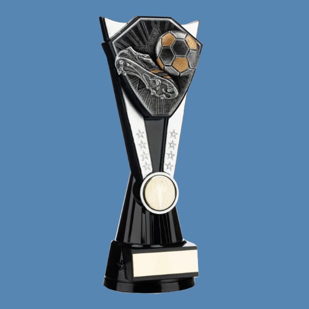 The Nova V Power is bound to be a favourite among players and coaches, thanks to its striking design and substantial feel. Finished in a two-tone black and silver, the main feature of this football trophy is a boot and ball design mounted on a V-shaped column.
