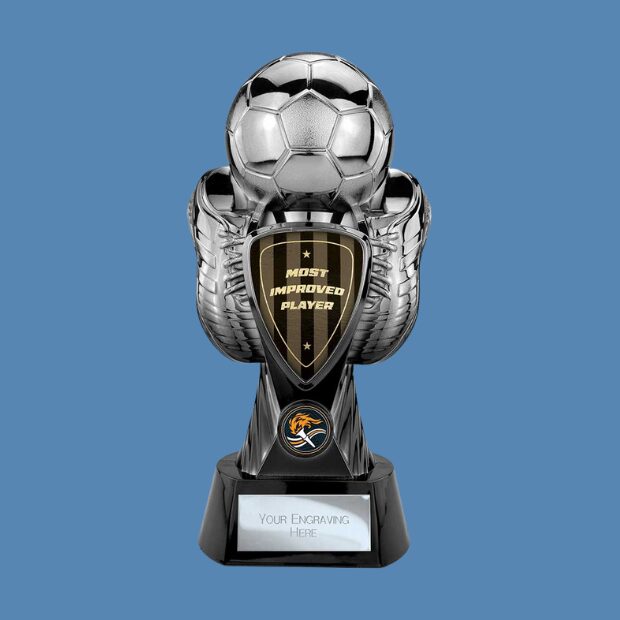A striking trophy, finished in gun metal to black fade, features a large football and boots as the central figure of the piece. The wording ‘most improved player’ is emblazoned on the face of the award/